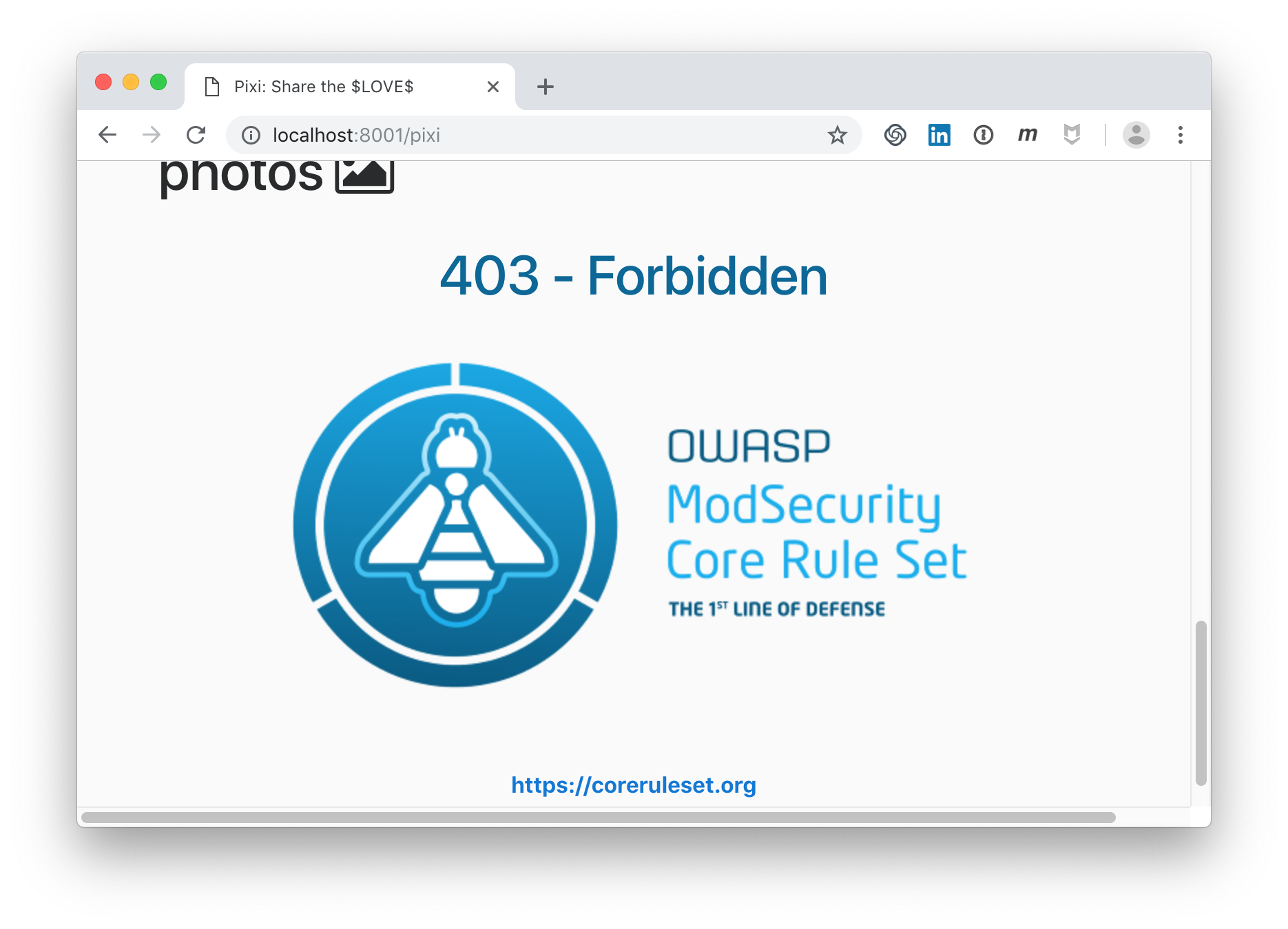 The Pixi application has even more vulnerabilities to demonstrate. Franziska plans to write about it in another blog post and to show how the CRS makes these vulnerabilities unexploitable.
